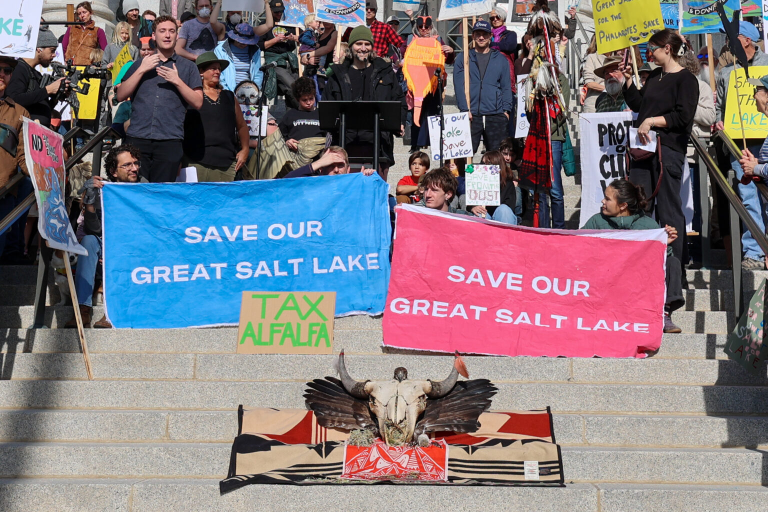 Demonstrators call for action to save the drying Great Salt Lake in a rally at the Utah State Capitol on Saturday, Jan. 31, 2026. (Will Ruzanski/Utah News Dispatch)