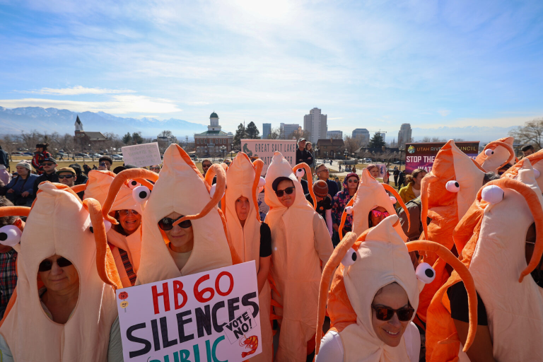 Demonstrators dressed as brine shrimp call for action to save the drying Great Salt Lake in a rally at the Utah State Capitol on Saturday, Jan. 31, 2026. (Will Ruzanski/Utah News Dispatch)