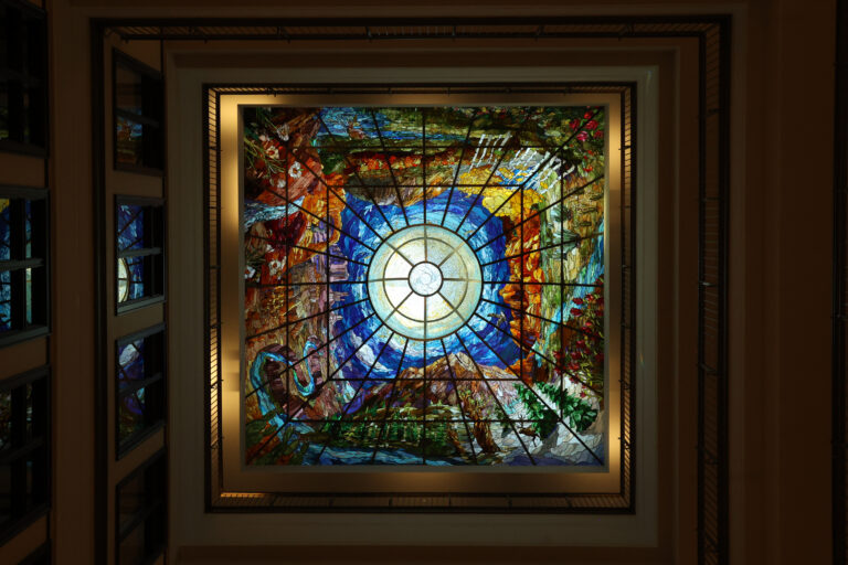At the center of the building is a $1.6 million stained glass laylight showcasing Utah’s natural wonders and cultural symbols. Made up of more than 14,700 individual pieces of glass with sand from all 29 Utah counties, the piece incorporates iconic Utah scenes like the Great Salt Lake and southern Utah’s red rock formations.