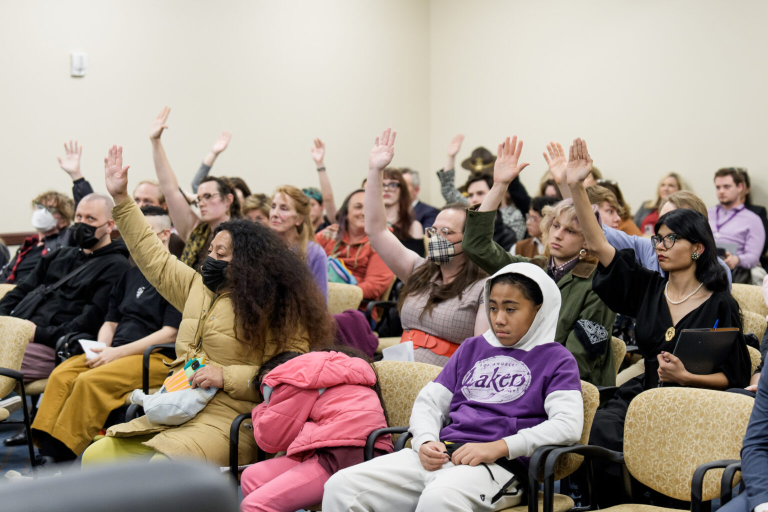 People raise their hands to indicate their opposition to HB193 in the Senate Business and Labor Standing Committee, at the Capitol in Salt Lake City on Thursday, Feb. 19, 2026. The bill would have banned government entities from using public funds to pay for insurance coverage for transgender employees who receive hormonal treatments or sex characteristic surgical procedures. (Photo by Spenser Heaps for Utah News Dispatch)