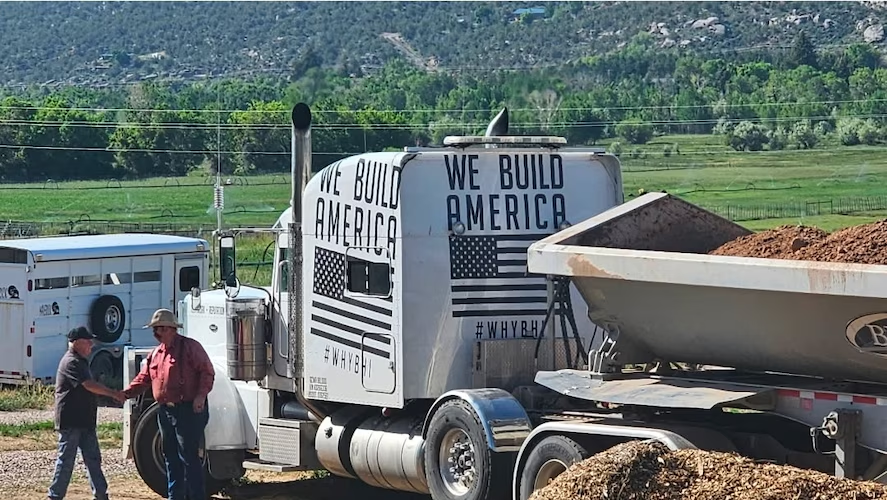 (Heath McDougal-Deans) On June 13, 2025, volunteer and neighbor Richard McDonald greeted Dennis Curtis as the Vernal branch of contracting company BHI provided Project Alley with 15 truckloads of dirt ahead of the opening of the women's addiction recovery home.