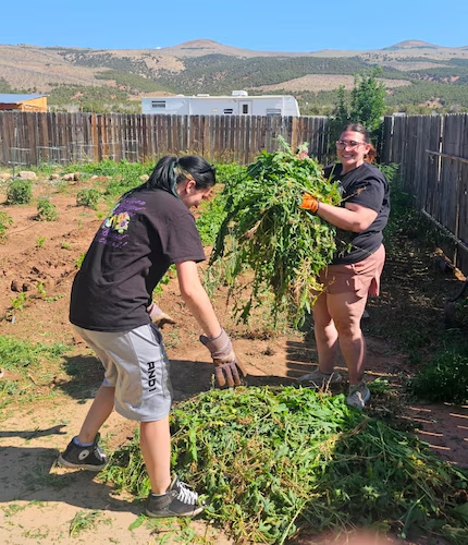 (Heath McDougal-Deans) On June 26, 2025, Madison Jones and Dakota Rogers helped remove weeds from the garden area as volunteers helped prepare Project Alley, a women’s addiction recovery home, for its November opening.