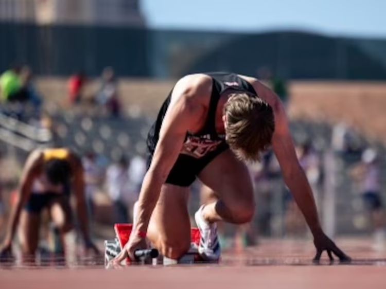 (Nick Pembroke) Nick Pembroke, a sprinter at Southern Utah University, sets himself in the starting block for the 4x400m at the Aztec Invitational in San Diego, California, in March 2024.